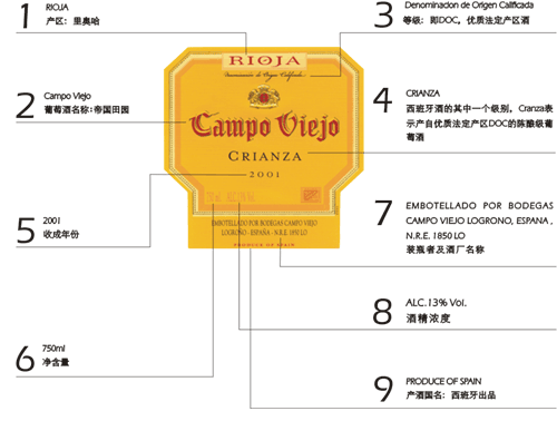 目前国内西班牙葡萄酒还是比较少见,找了个标签说明。不是很详细,不过可以参考^_^,或者到酒簿找支西班牙酒瞅瞅,看看是否可行~~