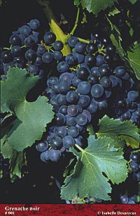 Grenache(歌海娜):生长势非常旺盛而且产量高的品种,开花时容易受雨水侵害。根据产地不同,开花一般在6月5日到15日之间,葡萄成熟在9月15日到10月10日之间。Grenache抗风抗旱非常好。南部Cotes du Rhone绝大部分的红葡萄酒是以Grenache为基础的,包括一些富于水果味的桃红葡萄酒。酒精度高,酸度低,成熟、圆润,富于果味和香料气味。主要用于教皇新城堡(经常超过60~70%的比例), Cotes du Rhone(最少要有40%)。