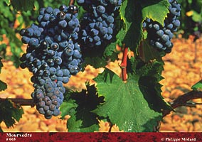 Mourvedre(幕尔伟德):中等产量,开花在6月5~15日,成熟与10月初。喜好多日照而温暖的气候,尤其在成熟期。对风比较敏感,需要少量而经常性的降水。单宁含量对于红葡萄酒非常理想,随着陈年时间香气的强烈程度和质量都会增加。抗氧化性强,用于延长葡萄酒的新鲜感在某些桃红酒中起到增加芳香的作用。