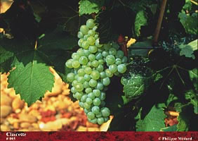 Clairette(克莱雷):长势非常旺,成熟与9月25~10月25日之间。对风敏感,喜好贫瘠干燥多石而温暖的土壤。对氧化敏感,可生产活跃,重酒体,带有复杂精致花香的葡萄酒。