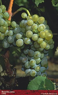 Bourboulenc(布尔布兰):难种植、长势旺的品种,9月25至10月25日之间成熟。因为成熟晚,需要高温的气候,只种植在南部。生产新鲜清爽、低酒精度的白葡萄酒,带有花香,适合年轻饮用。