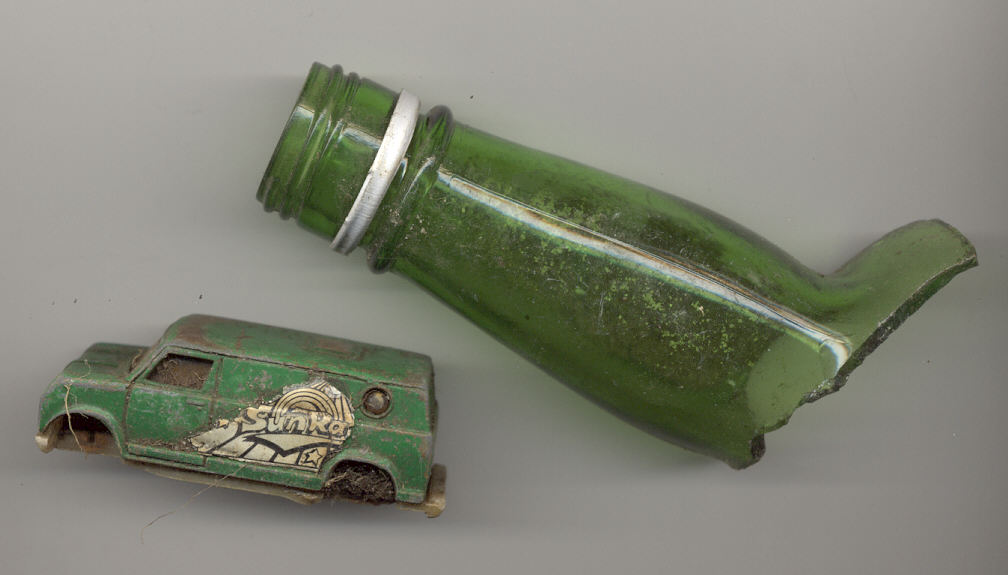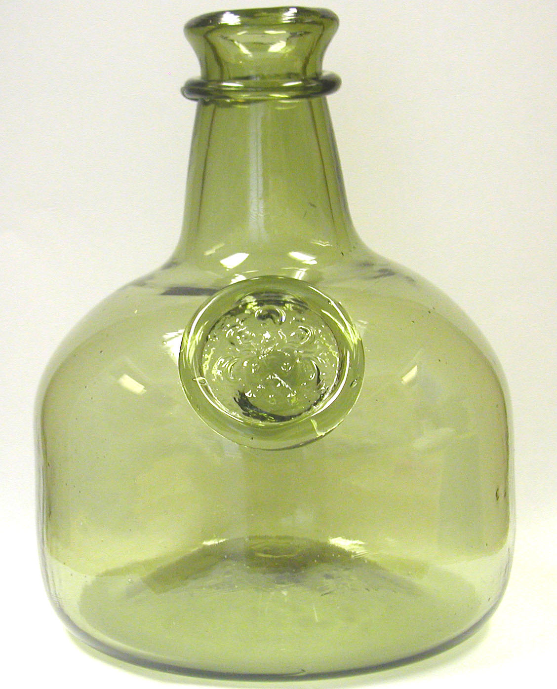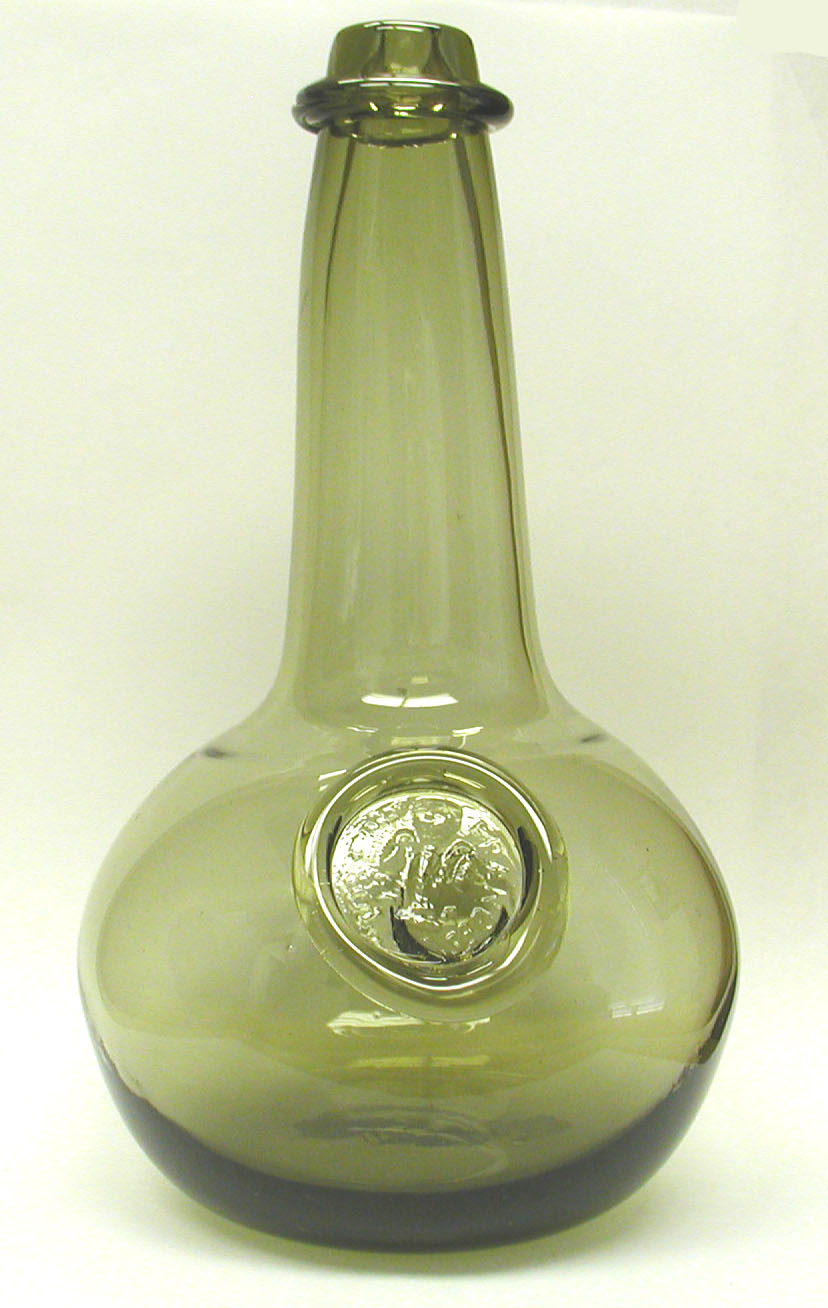 Long neck wine bottle with Joseph Francis seal, c. 1650-1665. Stands 10” high