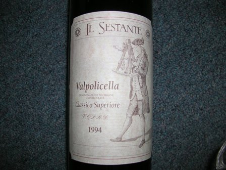 我对“话阿婆赤裸”的酒不太熟识,仅在不同时间喝过她不同的年份,计有1994,2000,2001和2003。今次谈的是IL SETANTE酒庄的1994 Valpolicella Classico Superiore DDOC VQPRD 12.5% 红酒。这酒庄位于近北的VENETO区很有名的Valpolicella产区里的Verona地区,有些国内朋友可能曾经喝过这地区的酒。这酒瓶标签没有说明採用了什么葡萄,但我猜一定有圣祖维斯Sangiovese这款意大利葡萄在内。