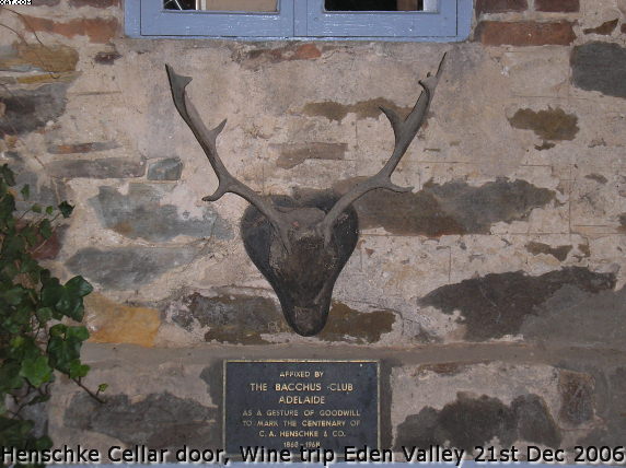 插一段,我对这个品牌的认识过程。不得不承认,之前我对Henschke(亨斯克)是有排斥心理的,这仅仅是缘于我不知道这个品牌的发音(这也是为何,这次我自己给了他一个中文名的原因)。可是当选择去Eden时,这个我到处可以看到的品牌,却很自然成为第一选择。尤其是在看了James的推荐之后,这里不得不点出酒评家对葡萄酒品牌推广、普及的重要性。我了解了发音,尤其是当我在品尝了他的酒,给我留下很好的印象时,我就非常愉悦地接受了他。而在酒庄院子里转悠时,找到他品牌盾形中的鹿头是,愈是增加了我对这个品牌的喜欢与接受。我个人联想了一下,觉得,盾牌中的字母H和C是从Henschke中提炼出来的;我发现的那个鹿头,和拍到的房子可能也是品牌的组成部分。