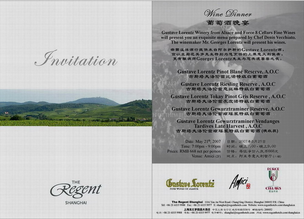 May 21th, Enjoy for only 668 RMB a special exquisite set menu prepared by Regent's Chef , Mr. Denis Vecchiato, pairing with the finest premium wines from Alsace prestented by Force 8 Cellars.