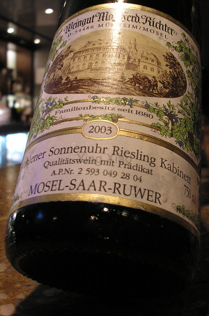 2003 Wehlener Sonnenuhr Riesling Kabinett 这来自Mosel-Saar-Ruwer地区的另一款Riesling,同样征服了我的味觉。他是有些霸气的,非常明显的煤油特征。丰富的口感,坚挺的酸与柔美的甜完美平衡,多了些醇厚;回甘,有矿物的清新与柑橘的一丝苦。93