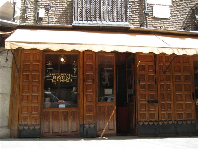 到了马德里,住进了位于puerta de sol的Hotel Europe。我们打算在马德里住5天,然后去Galica。第一次到西班牙,皇宫教堂斗牛皇马比赛都可以迟些参观,寻找美食是首要任务,早就听说吉尼斯世界记录中最古老的餐馆Bontin在马德里,顺着当地人的指点,我们走过Plaza Mayor,来到了calle Cuchilleros(“刀具市场街”,马德里的街名很多是根据以前在这街上从事的买卖贸易来命名的)这是家不起眼的餐馆,在橱窗里摆着吉尼斯的证书 “世界最古老的餐馆-1725年”,这是一家以乳猪和烤羊出名传统的Castilian餐厅,进门下楼是地窖式的厅,不是很大,两间房最多容纳30人,我们点了西班牙火腿,大蒜虾和烤乳猪,白酒Rias Baixas,红酒Riojo。他们的烤乳猪确实名不虚传,外脆内嫩,香美可口。藏酒很丰富,有名贵的旧世界酒到当地的餐桌酒,适合各个层次的爱酒人。