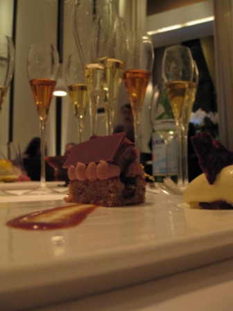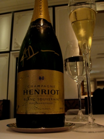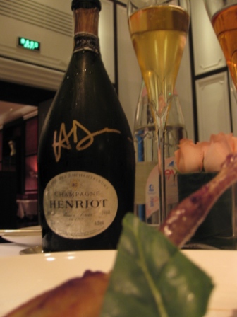 接下来就是法国经典的食物烤小鸟(或者是烤鹌鹑),总之非常的好吃,可惜照片上只有一支腿。与其搭配的当然就是1988年的珍藏香槟了,这是Henriot的顶级款香槟,一直以来可以媲美krug cristal 等。我们一直在讨论这支酒究竟有什么样的魔幻感受呢?我一拿起杯子,那香气散发出来,我忽然说,“Royal”;而其他人也同时说出了“imperial”,而旁边加拿大的女孩子说的还是中文“华丽的”。那不是可以简单语言形容的美妙滋味。我可以看到在每个人眼中的撼动,我想这次的晚餐是成功了。