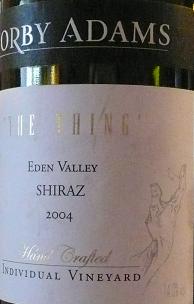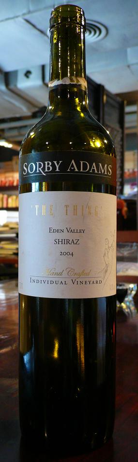 好酒我不喜欢在吃饭的场合喝,特别是只有一瓶的好酒,有事情要谈,有天要聊,要应酬,而且进餐的环境、酒具、甚至菜系是否配合都是关键,很多时候试不出酒的真味,难免可惜。最近的饭局就浪费了这样的一瓶酒,来自澳大利亚南部著名的产酒区布诺萨之伊甸谷:Sorby Adams “The Thing” Shiraz 2004。