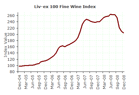 根据伦敦liv-ex 100指数显示,12月fine wine市场依然持续下跌行情,较上月下跌2.2%,2008年全年下跌14.6%,止于204.92点,跌回至2007年中水平。