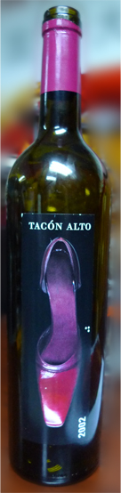 正标是一只红色的高跟鞋,黑色的背景与黑色的瓶身融为一体,只有年份(2002)和酒名:Tacón Alto (高跟鞋的西班牙语)。