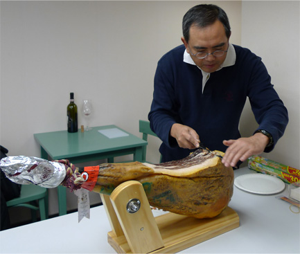 节前,黄先生特地从西班牙弄回一只黑猪火脚,让阿Ken约我节后到香港他的酒窖品尝,上星期终于成行,据黄先生说,这种西班牙黑猪火腿,开封后,最好能在7天左右吃完,其中第三天至第四天的深度是最好滋味的,我很幸运,排在第三天来享用。