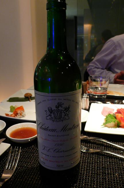 于是为了维护形象,自己便继续不爱说话下去了。还好吃的自助餐,不停地起身,各取所需,挑选食物,倒也冲淡了尴尬、冷场的可能。其实不是不爱说话,而是和陌生人见面总让我不知如何是好,而且年纪也大了啊。还好主人请喝的酒是大师罗伯特帕克给与100分的1990年的Château Moutrose玫瑰山庄,足以转移大家大部分的热情了。