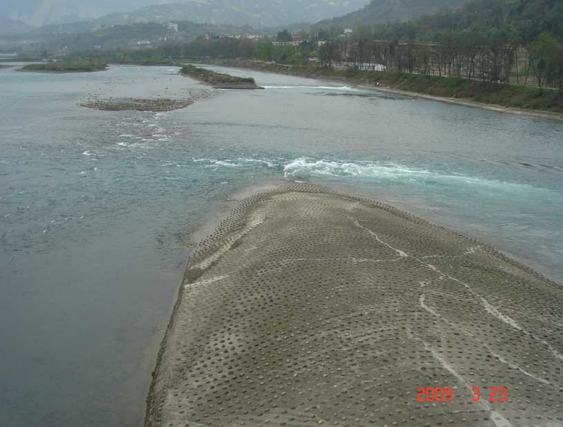 鱼嘴是修建在江心的分水堤坝,把汹涌的岷江分隔成外江和内江,外江排洪,内江引水灌溉。飞沙堰起泻洪、排沙和调节水量的作用。宝瓶口控制进水流量,因口的形状如瓶颈,故称宝瓶口。内江水经过宝瓶口流入川西平原灌溉农田。从玉垒山截断的山丘部分,称为“离堆”。