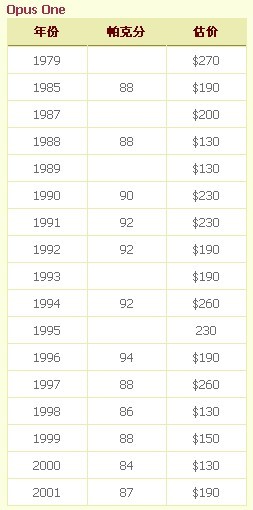 罗伯特·蒙大维酒园(Robert Mondavi Winery)以酿造纳帕谷顶级赤霞珠闻名世界。而“OPUS ONE”(作品一号)是Robert Mondavi家族与法国Chateau Mouton Rothschild(木桐堡)的Philippe de Rothschild男爵便携手合作在加州酿出的顶级名酒。该酒推出后,多年来皆获得知名的酒评家和收藏家的喜爱;它酒体并非特别雄厚,不过在各方面皆很均衡,这点颇符合法国名酒所追求的目标。尽管“OPUS ONE”的初衷是创造出自己的风格,而不是法国波尔多的翻版,但行家们还是品出该酒反映出了波尔多地区,特别是梅多克地区的风味。行家评语也从侧面印证了“OPUS ONE”的绝佳品质:深红的色泽,黑莓与橡木桶香味,饱满而深沉,让人确信其耐得久藏。“OPUS ONE”堪为两种酿酒文化的荟萃和结晶,遗憾的是Philippe男爵已于1988年去世,两位大师无法再携手谱写第二号作品,“OPUS ONE”遂成绝响。
