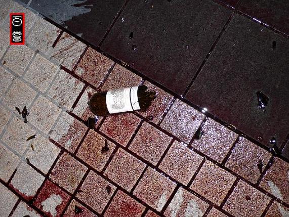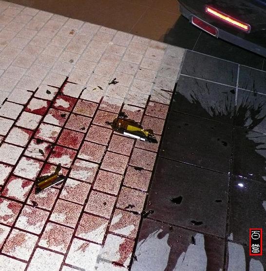 一辆中港两地牌的车停在那里,车尾箱大开,一地的酒液衬托着瓶子的残骸。