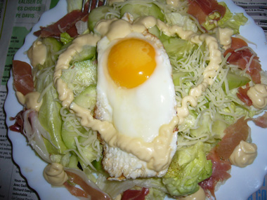 是一个杂菜沙拉,将玻璃生菜和黄瓜丁与奶酪丝火腿碎、用baslique醋和老dijon芥末糖调配的酱汁混在一起。上面再加一个半生熟的煎蛋就完成了。