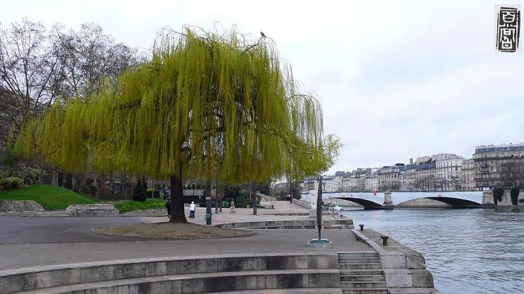 新旧建筑交伴、眺望着著名的一些建筑物熟悉的尖端、巴黎圣母院的背影,结果最照眼的还是:春从何处归,岸柳弄娇黄。很久没在北方过春天了,今次竟在异国重逢故乡那柳明映岸的春意。