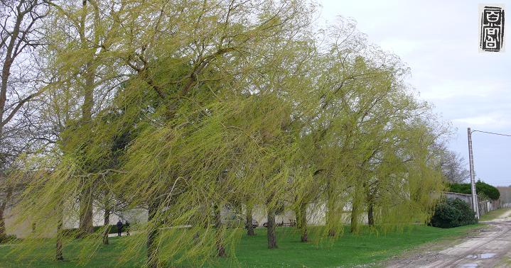 于是,在接下来的日子,无论是波尔多产区Le Gironde(芝朗迪)河的两岸:St. Emilion(圣达美利安), Pomerol(庞美洛),Medoc(美都),Grave(格拉夫);还是在大西洋岸小城Arcachon(阿卡松);甚至南下地中海然后再北上Dijon(第戎),在勃艮地产区从北到南、再从南到北:Geverey-Chambertin(哲维瑞-香贝田),Morey-Saint-Denis(莫内-圣丹尼斯),Nuits-Saint-Georges(夜之圣佐治),Aloxe-Corton(阿罗斯-高登),Beaune(博恩),Chassagne-Montrachet(夏山-蒙哈榭),等等,总是在有意无意的寻找着柳树的身影,一路走来也竟然真的总能有柳树亭亭的在路边、在葡萄田近处、在酒庄门口依依逢迎。