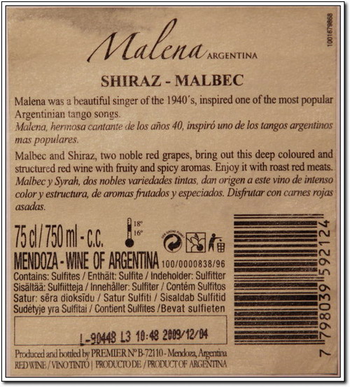 酒名:Malena Shiraz Malbec 2009 Mendoza