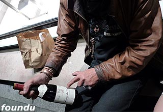 那天晚上,我们在香榭丽舍大道上一家餐厅用餐,差不多快结束时,主角出场了——一位头发蓬垢,穿着皮衣的老大爷走入视线。在巴黎有流浪者不出奇,但这位老人家下面的“一系列动作”引起我们的兴趣。只见他来到已打烊的品牌时装店的大橱窗前,往前摆放上件破衣服,上面丢上几个硬币零钱,然后就坐在橱窗下的台阶上。接着,不知道从身边哪个袋子里掏出两瓶酒来。远处看,有瓶好象是勃艮地的酒,我们顿时兴奋了下,眼见他不紧不慢的拿出把酒刀,非常专业熟练的打开其中的一瓶酒,先放置一边(应该是醒酒),随后拿起另一瓶(小半瓶)对着嘴巴吹起来。这情形使得我们见识到这个葡萄酒已经渗透到血液的国家,的确是名不虚传。
