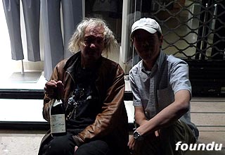 我等实在按捺不住,和懂法语的朋友上前与他搭讪攀谈起来,还好此位犀利爷还很和蔼,他告诉我曾做过印刷工人、贸易秘书等行当。犀利爷很朋克,脖子上,手腕带满着饰物。而刚打开那瓶酒,他告诉我们是从一家阿拉伯的小超市花4欧元买来的,来自隆河地区的酒。他说他每天都在这里“练摊”,如果我们愿意,可以去”他家“做客。真是热情。他也问我们来自哪里,当知道我们是中国人时,说喜欢中国人,不喜欢美国人……我们拿了些酒、甜品和一些零钱给他,我想这些钱明天也许会变成另两瓶酒吧。当我们最后问询是否可以与他合影,他欣然接受,并与我们“salute”——干杯。也祝犀利爷健康。