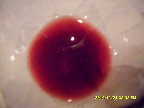 大红偏向紫色,清澈明亮,液带微有层次,边缘水分充足;