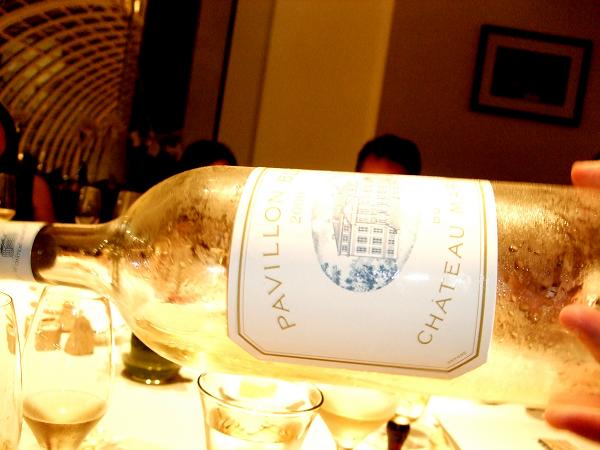 终于等来了第一杯酒:2000玛歌白亭双瓶装,年产量极其稀少,只有1000箱。对于年龄超过10年的波尔多白酒,着实很惊讶,香气上很难判断是100%的白苏维浓,色泽还是透着新鲜的淡黄,一点也不像10年的老酒,口感层次复杂,有着较浓的香草,矿物,酸桔味,收味的酸度也让保持了长年的活力。很有点PULIGNY MONTRACHET的感觉。后来才知道,它可是在法国橡木桶保存了一年后装瓶的。
