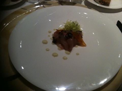 with apple puree, bottarga and lentils vinaigrette 苹果汁浸黄尾鱼配葡萄醋(可惜是用IPHONE拍得,不清楚)