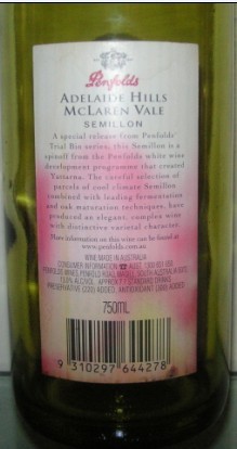 奔富赛美蓉(Penfolds Semillon)1994白酒产自南澳阿德来德山之麦拉伦谷(Adelaide Hills McLaren Vale)。酒厂特意标明Trial Bin(试验出品)和限量低温种植赛美蓉葡萄作为此酒之标榜卖点。酒厂在背标还强调这酒是经过特殊工艺(包括木桶陈酿的精湛技术),勘称是酒厂在酿造白酒领域里的一项重大突破(当然,酒厂的原文表达谦称是“一项副产品而已”)。