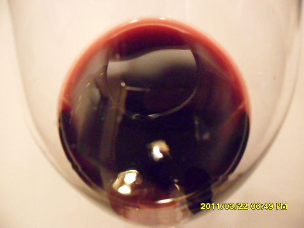 入口似可乐,没有感到刺激提神,只有舌则感受到酸甜果味,酸度拉不开,酒体稀薄,行腔后余香一闪即逝;松弛乏力,张力不达两腮上腭,收结后单宁遍布舌面舌则腮角,果味提早减退,显得寡辣,酒架(以先退出的酸度起计)退出大概十分钟。