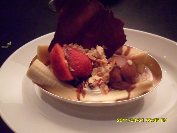 甜品香蕉船:巧克力、草莓、可可冰淇淋、果仁瓜子、蛋奶忌念摆设充满美感。配甜白百搭。