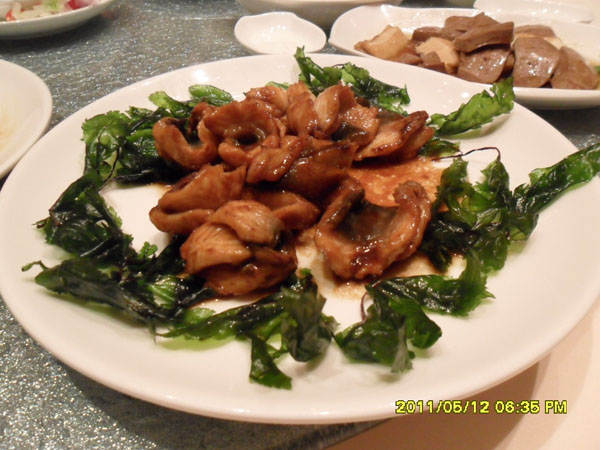 片皮鸭:味道甘香,薄饼吸油而且刷干味蕾,合适配酒。葱条却气味太大,上桌后酒香被葱的味道影响了。