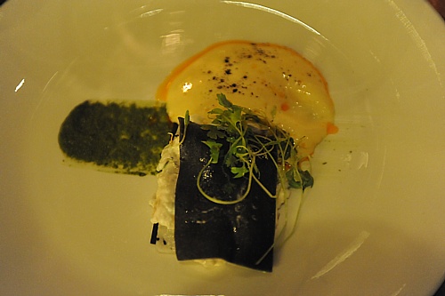 第二支Puligny-Montrachet 2007虽然是支村级酒,但中规中矩。落杯就散发着榛子香、典型的蕨类,梨子、青苹果,优雅中隐着奶油底韵。入口酒体轻盈利落,爽脆鲜美的果酸,生津怡人,均匀细腻中前后流畅,悠长的结尾稍带Chardonnay的涩味。配餐是三文鱼三吃,3 salmon styles sashimi,pickled radish and roe tartare “spring roll”wasabi mayonnaise vodka cured,puffed skin。