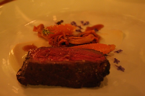 好酒加上岁月的磨砺,已经不必关心此时上的主菜:西冷牛肉配奶油花菜泥、手指胡萝卜和茶树菇。如果说勃艮第中Geverey Chambertin 的风格表现是豪气冲天的英雄气概,而Vosne Romanee则代表风姿绰约充满韵味魅力的大家闺秀,那么Chambolle Musigny 无疑就是Cote de Nuits 中最温柔婉约的窈窕淑女,是最能表现Pinot Noir 葡萄细致优雅的一面。此刻神往的是Drouhin家在爱侣园十分之一多一点的那块仅有0.59公顷的美妙田地,正是那最具温柔婉约的Chambolle Musigny村的一级田Les Amoureuses。