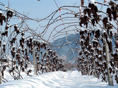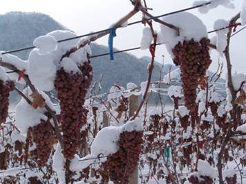 寒冷的雪夜。葡萄园。一串串葡萄挂在树上,一个个被雪冻得挤眉弄眼。一群人在园地里,不是看星星,不是看月亮,不是风花雪月那么浪漫,而是在采摘酿造冰酒的葡萄。为什么不等天亮了有太阳时暖和一些再采摘?那是因为,采摘酿造冰酒的葡萄,不分日夜,但定要在自然冰冻到一定时刻才能进行。过早或过晚地采摘,都会影响到冰酒的风味。