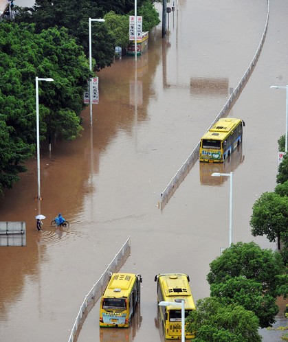 暴雨后,几辆载着乘客的公交车被困在积水里