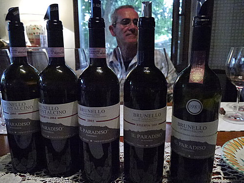 The view from Florio's vineyards ranges from the hills and woods of the Crete Senesi on one side to the mass of Montalcino to the other. We went there as the sun was setting during the “Benvenuto Brunello” event [note: the Consorzio's annual tasting event]. We could see why the place is called Paradiso. In fact, we couldn't have thought of a better word to describe it. On top of that, Florio and his daughters were kind enough to tell us the story of every stone and every flower that grows in the place. If you could stay, you'd never leave. Sadly, we had to go.