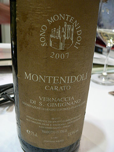 我们试了她的两款白酒 Vernaccia di San Gimignano,其中 Fiore 没有用木桶陈年,比较轻盈可爱;Carato 则用了小木桶,香气更多,也更复杂。
